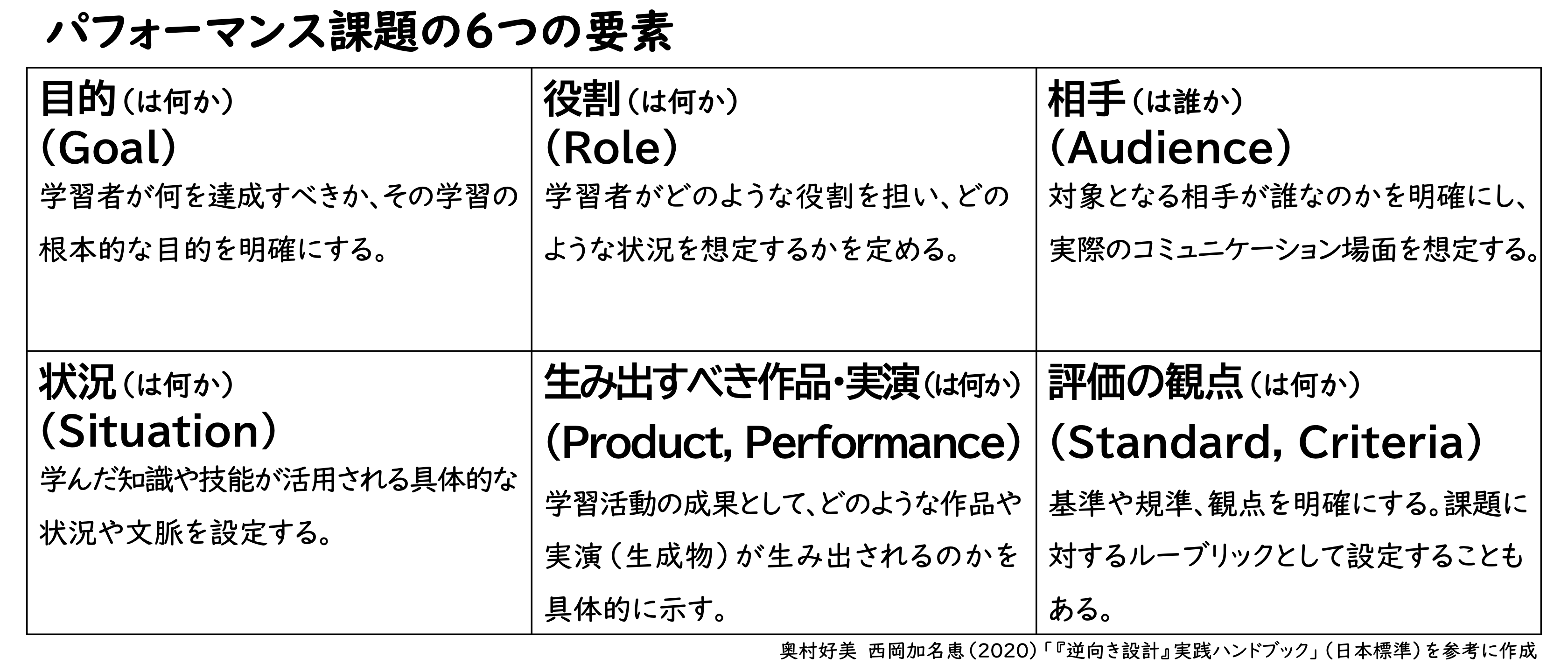奥村好美・西岡加名恵(2020)『「逆向き設計」実践 ガイドブック-「理解をもたらすカリキュラム設 計を「読む・活かす・共有する」-』日本標準