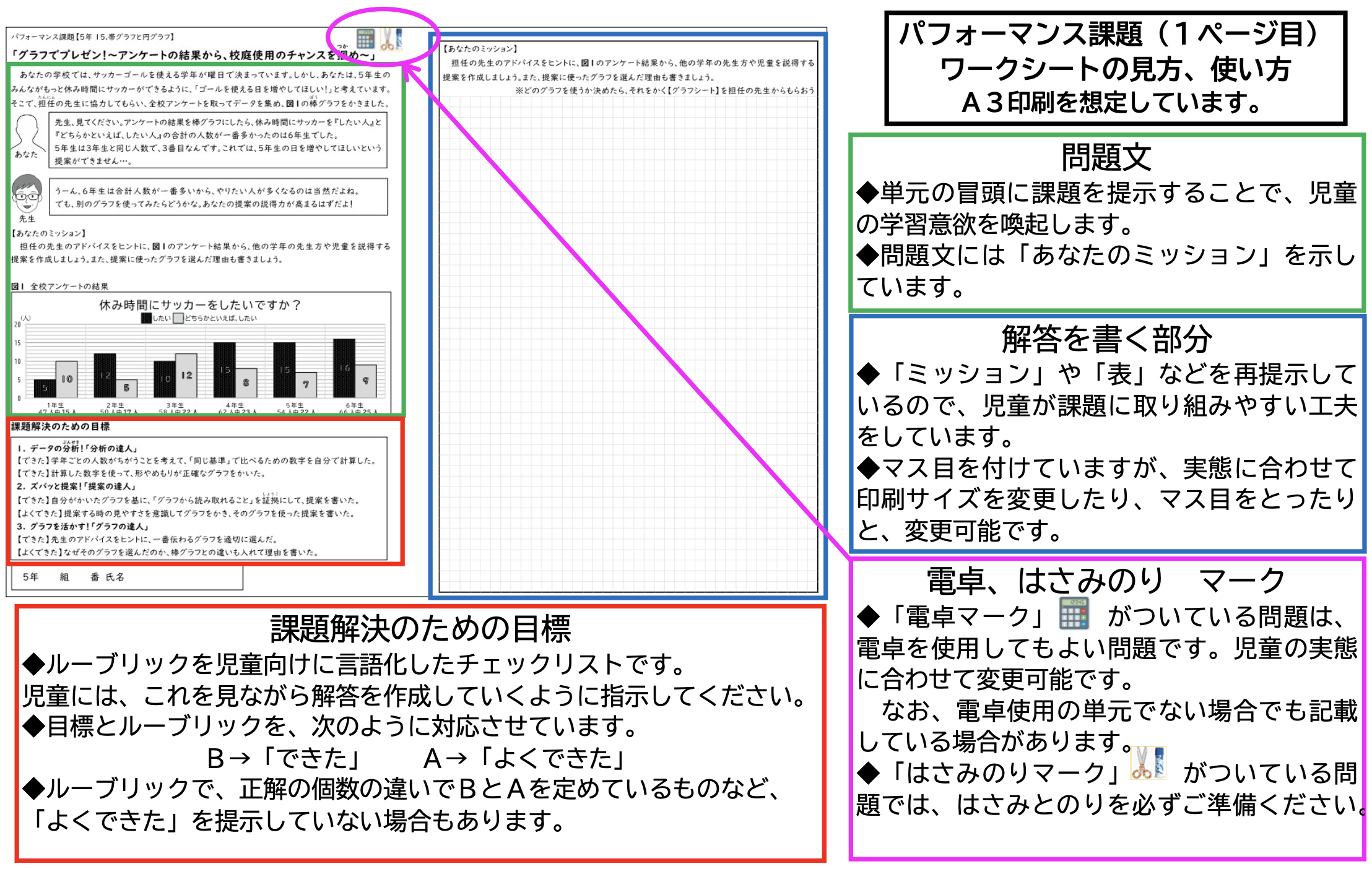 ・ワークシートおよび模範解答はA3サイズで作成しています。ワークシートは必要部数を印刷して配布してください。