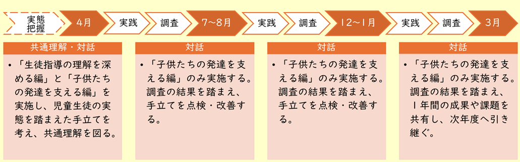 実践後、⓪で実施した実態調査(生活アンケート、各種意識調査等)を再度実施し、児童生徒の変容を見ます。結果を基に、②の子供たちの発達を支える編を実施し、手立てを点検・改善します。